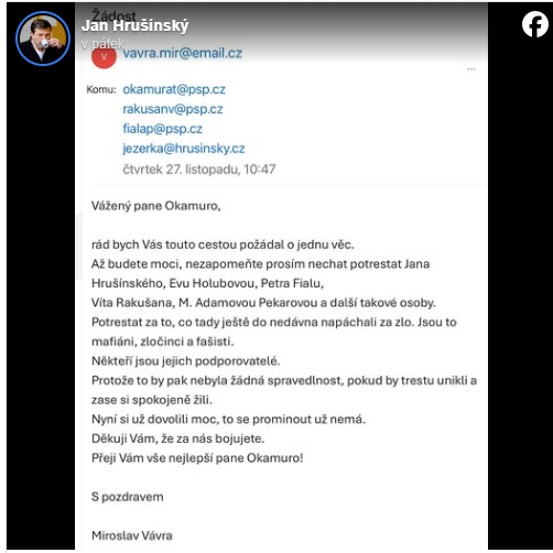Podle Hrušínského se v jeho divadle objevil e-mail, který údajně putoval i k Tomiu Okamurovi. Hrušínský sám tvrdí, že obsah působí jako objednávka trestu pro několik osob veřejného života. Herec okamžitě reagoval a atmosféru přirovnal k časům, které si česká společnost rozhodně nepřeje znovu prožít. Do své reakce vložil i citaci, která vzbudila vlnu emocí: „Nová vláda ještě nevznikla, ale začíná to nabírat pěkné obrátky. Včera nám v divadle přistál e-mail od pana Miroslava Vávry, který poslal předsedovi Poslanecké sněmovny T. Okamurovi jako objednávku potrestání Jana Hrušínského, Evy Holubové, Petra Fialy, Víta Rakušana, M. Adamovou Pekarovou a další takové osoby. Prý jsou to mafiáni, zločinci a fašisti (viz níže).