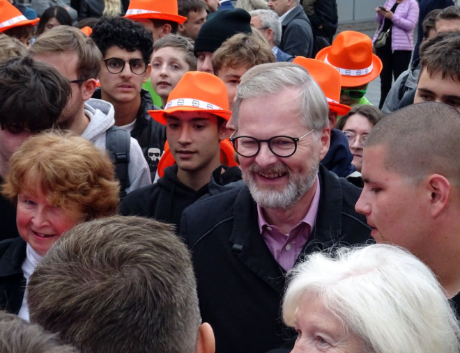 Premiér pokračoval jasným vzkazem: Nenechte si namluvit, že už je rozhodnuto, že už Babiš s Okamurou a Konečnou sestavují nějakou vládu. Oni ji sestavují ve svých hlavách, oni už se těší na to, jak nás posunou někam na východ, ale to není cesta, kterou by měla jít Česká republika.“ Publikum jeho slova přijalo bouřlivým potleskem.
