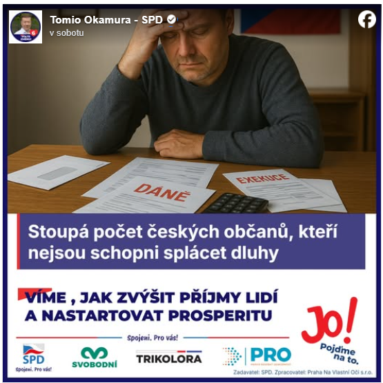 Okamura tvrdí, že jeho hnutí má konkrétní plán, jak zastavit ekonomický propad a pomoci lidem z dluhové pasti. SPD podle něj připravila rozsáhlou koncepci daňové a sociální reformy, která by měla zvýšit příjmy rodin a podpořit růst reálných mezd. Cílem je, aby lidé měli více peněz z vlastní práce a nebyli tlačeni do půjček a exekucí.