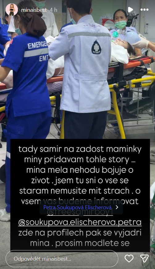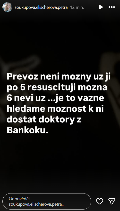 Zoufalství neskrývá ani Mínina maminka Petra Soukupová Elischerová, která začala okamžitě shánět pomoc přes sociální sítě i cestovatelské skupiny. Nešlo přitom jen o podporu nebo povzbudivé vzkazy, ale hlavně o snahu sehnat konkrétní kontakty a možnosti, jak dceru dostat do lepší nemocnice. V příspěvcích otevřeně popsala, že zařízení, kde její dcera leží, nemá dostatečné možnosti pro tak vážný případ. Situace podle všeho nabrala tempo, kdy každá minuta mohla hrát zásadní roli, a rodina proto začala hledat řešení i mimo oficiální cesty.