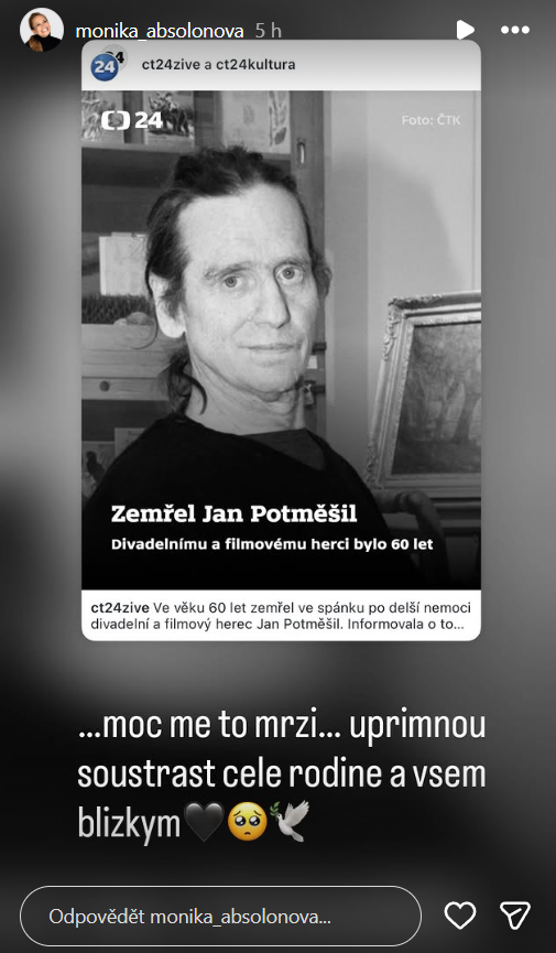 K úmrtí se vyjádřila také Monika Absolonová. Její reakce byla stručnější než některé jiné, přesto v ní zazněl opravdový soucit a lidské pochopení bolesti, kterou nyní prochází hercova rodina i jeho blízcí. Zpěvačka napsala: „Moc mě to mrzí. Upřímnou soustrast celé rodině a všem blízkým,“ a právě jednoduchost těchto slov ukázala, že ve chvíli podobné ztráty často není potřeba dlouhých vět. Někdy naopak nejvíc zasáhnou ty nejprostší. I tato zpráva zapadla do mozaiky rozloučení, která potvrzovala, že Jan Potměšil měl v uměleckém prostředí výjimečné místo. Nepůsobil jako člověk, kterého by kolegové vnímali s odstupem. Naopak bylo zřejmé, že v nich zanechal blízký a velmi osobní otisk.
