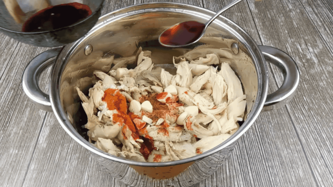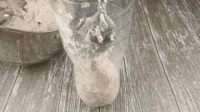 Až bude kuře vychladlé, oddělte maso od kostí. Nezapomeňte maso také natrhat nebo nakrájet na menší kousky. Pro lepší barvu je dobré použít trochu červené řepy. Nastrouhejte ji a vymačkejte z ní šťávu. Kuřecí maso vložte do hluboké nádoby, přidejte vývar s želatinou, sůl, sladkou papriku, česnek (nakrájený na kousky) a šťávu z červené řepy. Vše rozmixujte tyčovým mixérem. Láhev důkladně umyjte a odřízněte hrdlo. Masovou pastu nalijte do láhve, zakryjte potravinářskou fólií a nechte v lednici minimálně 3 hodiny. Dobrou chuť!