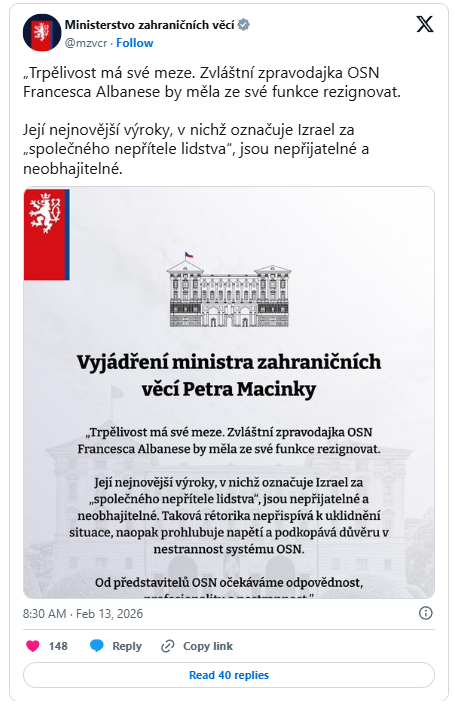Ministr zahraničí a šéf Motoristů Petr Macinka ostře vystoupil proti zvláštní zpravodajce OSN pro lidská práva na okupovaných palestinských územích Francesce Albaneseové. Na sociální síti X ji veřejně vyzval k rezignaci. Podle něj měla na konferenci v Kataru označit Izrael za „společného nepřítele lidstva“, což považuje za naprosto nepřijatelné. Ve svém vyjádření uvedl: „Trpělivost má své meze. Zvláštní zpravodajka OSN Francesca Albaneseová by měla ze své funkce rezignovat. Její nejnovější výroky, v nichž označuje Izrael za ‚společného nepřítele lidstva‘, jsou nepřijatelné a neobhajitelné,“ napsal Macinka.