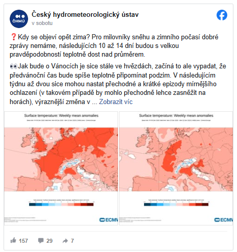 Meteorologové z Českého hydrometeorologického ústavu přišli s upřesněním předpovědi, která může překvapit každého, kdo už si představoval zasněžené ulice a blížící se sváteční atmosféru. Z jejich zprávy totiž vyplývá, že nadcházející dny budou spíše pokračováním podzimu než začátkem zimy. Teploty mají vystoupat na neobvykle vysoké hodnoty a zima se podle odborníků na dohled vůbec nerýsuje.