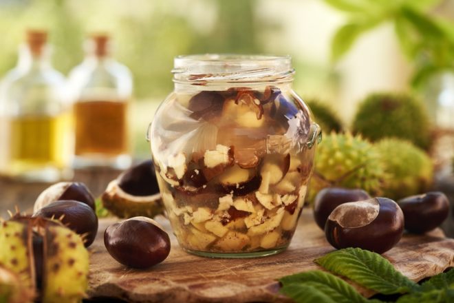 Častým zpracováním kaštanů je také tinktura. Stačí očistit 5-7 plodů a nakrájet i se slupkou. Vložte je do zavařovací sklenice, zalijte alkoholem (např. vodkou) a uzavřete víčkem. Postavte směs na tmavé místo a nechte louhovat 3 týdny. Poté tekutinu přeceďte do tmavé lahve. Používejte ji podobně jako mast a kaštanovou tinkturu vtírejte do bolavých kloubů nebo svalů.