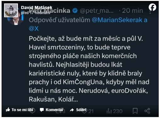 Celá kauza ukazuje, jak silné emoce dokáže jméno Václava Havla stále vyvolávat. Jediná věta politika stačila k tomu, aby se rozjela masivní debata, do které vstoupily známé osobnosti i tisíce běžných uživatelů. Reakce Davida Matáska dodala sporu další rozměr a potvrdila, že hranice mezi ironií, kritikou a urážkou zůstává velmi tenká. Ať už stojí lidé na jakékoli straně, je zřejmé, že podobné výroky budou českou společnost rozdělovat ještě dlouho.
