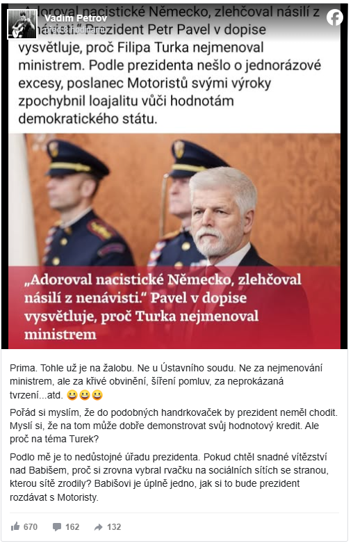Rozhodnutí prezidenta Petr Pavel nejmenovat Filipa Turka ministrem životního prostředí vyvolalo okamžitou reakci. Hlava státu své stanovisko detailně popsala v otevřeném dopise adresovaném premiérovi a opřela ho o dlouhodobé výhrady vůči Turkovým postojům i veřejným vystoupením. Podle prezidenta jde o ochranu důvěry v ústavní řád a hodnoty, na kterých stojí český právní stát. Právě tato argumentace ale Turka zasáhla nejcitlivěji a proměnila politický spor v osobní konflikt, který má nyní skončit až u soudu.