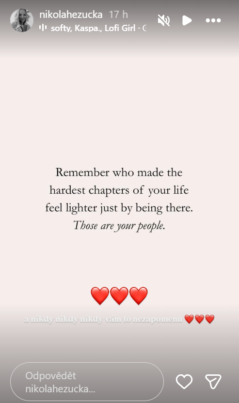 Nikola zároveň sdílela na Instagramu dojemný citát: „Pamatuj si, kdo udělal nejtěžší kapitoly tvého života lehčími, jen tím, že tam byl s tebou. To jsou tvoji lidé.“ Sama k tomu doplnila: „Nikdy, nikdy, nikdy vám to nezapomenu“. Její slova jasně ukazují, jak náročné období rodina prožívá a jak moc si váží podpory lidí kolem. S Patrikem vychovává jejich vymodleného syna Olivera, což celou situaci dělá ještě citlivější.