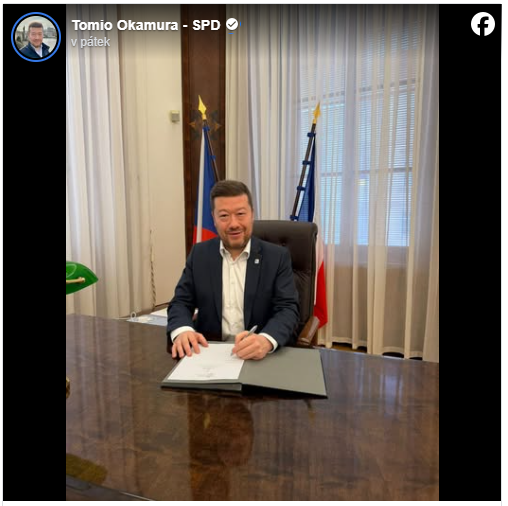 Politik se ke změně otevřeně přihlásil na sociálních sítích, kde vše okomentoval přímo na kameru. Ve videu zazněla slova, která okamžitě obletěla internet: Tak jsem přišel do své nové kanceláře ve sněmovně. A koukám, co tady mám po paní Pekarové Adamové. Tak jsem si to tady upravil po svém, řekl Okamura. Vlajku EU označil za relikt své předchůdkyně Markéta Pekarová Adamová, čímž dal jasně najevo, že se chce od jejího stylu vedení sněmovny distancovat.