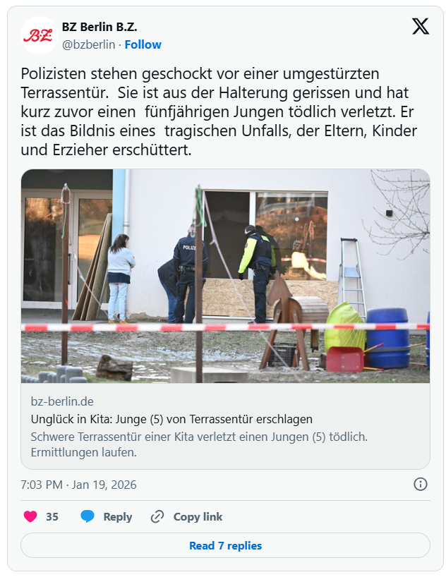 Ve školce v jihovýchodní části německé metropole Berlín došlo k tragické nehodě, která otřásla celým městem. Na pětiletého chlapce spadly skleněné dveře, když byl ve školce ve čtvrti Niederschöneweide. Ačkoli na místo okamžitě dorazily všechny záchranné složky, chlapec bohužel na místě zemřel. Událost probíhá jako vyšetřování tragické nehody. Policie v Berlíně se snaží zjistit příčiny tohoto neštěstí a porozumět okolnostem, které vedly k pádu skleněných dveří.