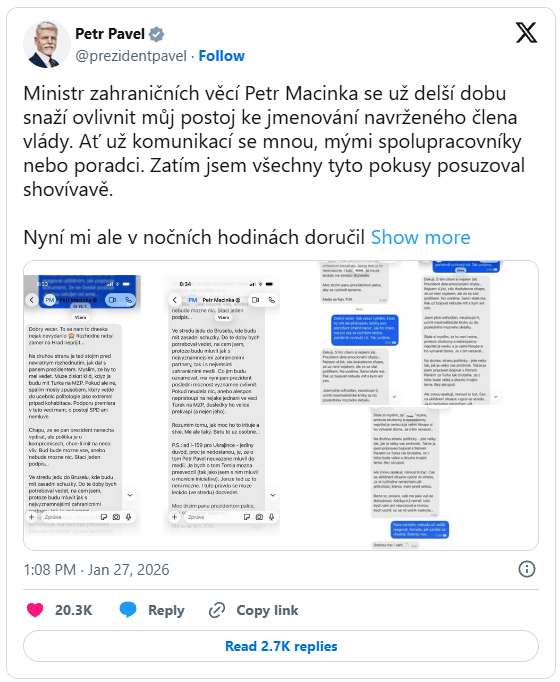 Petr Pavel se ocitl v centru mimořádně vážné politické kauzy, která nemá v posledních letech obdoby. Policie se začala zabývat textovými zprávami, jež měl ministr zahraničí Petr Macinka zaslat poradci prezidenta, a podle hlavy státu nejde o běžnou politickou komunikaci, ale o pokus o vydírání. V následujících řádcích se podíváme na to, co přesně stálo ve zprávách, proč je prezident považuje za zásadní hrozbu a jaké dopady může mít celý případ na vztahy mezi Hradem, vládou a klíčovými politickými hráči.