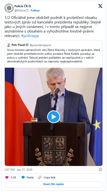 Celý případ se rozjel ve chvíli, kdy se na veřejnost dostala informace, že policie oficiálně prověřuje obsah textových zpráv, které měl ministr zahraničí Petr Macinka odeslat poradci prezidenta Petra Pavla. Podnět k prošetření podle dostupných informací přišel přímo z kanceláře prezidenta republiky. Policie potvrdila, že se nejprve detailně seznámí s obsahem zpráv a následně vyhodnotí jejich trestně-právní relevanci, přičemž rozhodne i o tom, který útvar se případem bude dále zabývat. Už samotný fakt, že se komunikací mezi ministrem a prezidentovým okolím zabývají vyšetřovatelé, vyvolal v politickém zákulisí značné napětí.