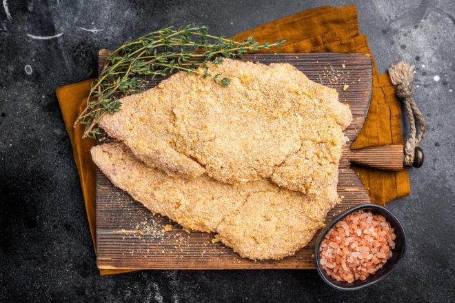 Po dni v lednici mísu vyndejte, vyjměte i jednotlivé plátky masa a nechte je okapat, v případě potřeby je osušte papírovou utěrkou. Nyní už je čas na klasický trojobal. Do jednoho talíře nasypte mouku, do druhého rozšlehejte vajíčko s trochou mléka a do třetího nasypte strouhanku.