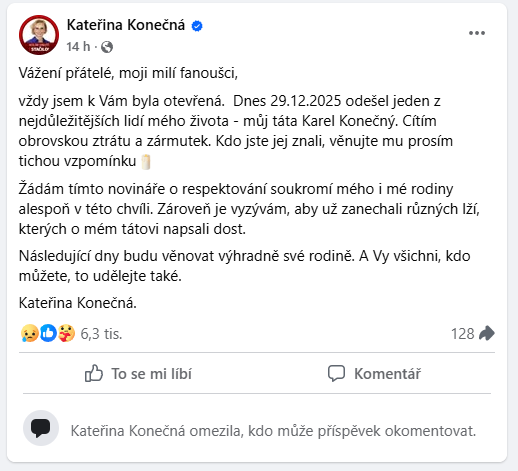 Krátce po oznámení smutné zprávy zveřejnila Kateřina Konečná vyjádření na sociální síti Facebook, kde se svěřila se svým zármutkem. Napsala: „Vážení přátelé, moji milí fanoušci, vždy jsem k vám byla otevřená. Dnes 29. 12. 2025 odešel jeden z nejdůležitějších lidí mého života – můj táta Karel Konečný. Cítím obrovskou ztrátu a zármutek. Kdo jste jej znali, věnujte mu prosím tichou vzpomínku,“. Slova plná emocí se měla stát tečkou za veřejnou debatou.